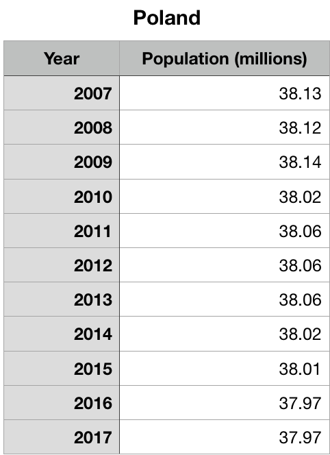 3) Population and exponential change can be negative as well as positive. Graph the data showing Poland's population over the last decade using a graphing calculator or an online app (Desmos, for example). Derive an exponential equation that models the change. (Reminder: The numbers are easier to deal with if you graph years since 2007 instead of the actual year.) Assuming the same change in Poland's population continues, what does your equation predict that the population will be in 2030? 2050?