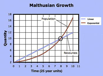 Assuming then my postulata as granted, I say, that the power of population is indefinitely greater than the power in the earth to produce subsistence for man. Population, when unchecked, increases in a geometrical ratio. Subsistence increases only in an arithmetical ratio. A slight acquaintance with numbers will shew the immensity of the first power in comparison of the second.